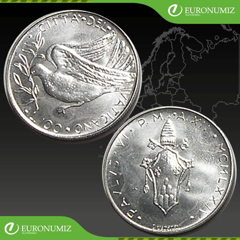 100 LIR 1974 VATIKAN PAVOL VI MIER A POKOJ STAV VID FOTO