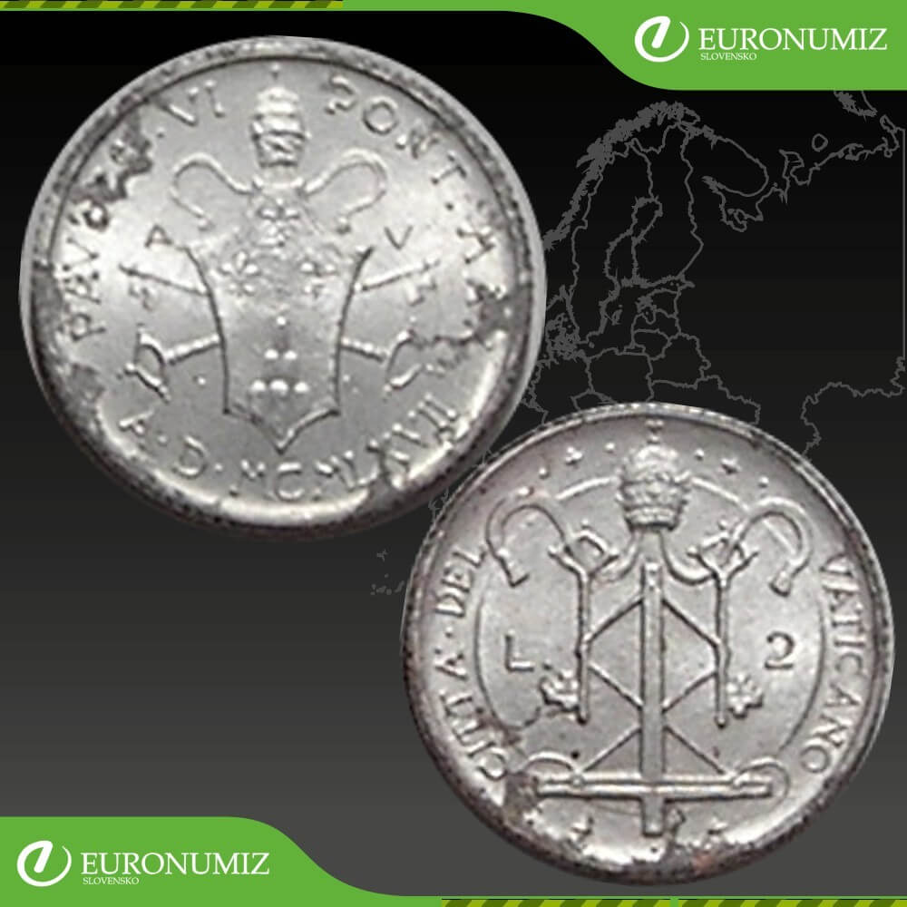 2 LIRA 1967 VATIKAN PAVOL VI PAPEZSKA TIARA STAV VID FOTO